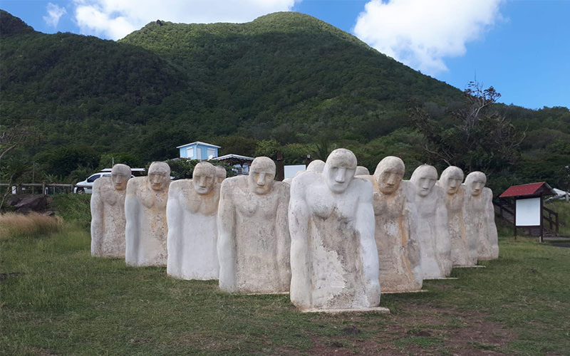 Le mémorial Cap 110, situé à Anse Cafard, sur la commune du Diamant, fut édifié en 1998, à l’occasion du 150ème anniversaire de l’abolition de l’esclavage. Le concepteur, Laurent Valère, est un artiste martiniquais né en 1959. Ce monument commémoratif a été érigé en hommage aux victimes du nauvrage d'un navire. Le bateau d'esclaves qui a coulé à Anse Cafard est le "Saint-Esprit", un navire français transportant des esclaves en provenance d'Afrique. En 1721, ce bateau a fait naufrage à proximité de la plage de l'Anse Cafard. Il y aurait eu des centaines de victimes, principalement des esclaves, qui ont péri dans cette tragédie. Ce naufrage est souvent cité comme un événement tragique dans l’histoire de la traite négrière, symbolisant les souffrances infligées aux populations africaines durant cette période sombre. Le mémorial de l'Anse Cafard est constitué de 15 statues en pierre qui symbolisent les esclaves, regardant la mer en direction du Cap 110 (cap du Golfe de Guinée d’où venait vraisemblablement le navire). C'est un hommage à ceux qui ont perdu la vie lors de ce naufrage et à toutes les victimes de la traite négrière. Ce monument est un lieu de mémoire et de réflexion, soulignant l'impact profond de l'histoire de l'esclavage sur la Martinique et la Caraïbe.