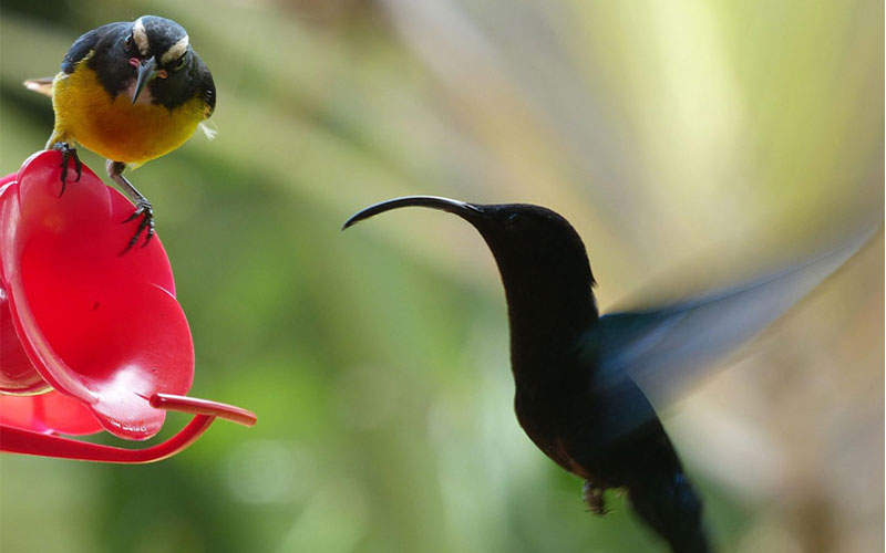 Le colibri de Martinique, ou Anthracothorax viridis, est un petit oiseau au plumage éclatant, principalement vert irisé avec des reflets bleus. Il mesure environ 10 cm et se nourrit principalement du nectar des fleurs, mais peut aussi attraper des insectes pour compléter son alimentation. Les colibris battent leurs ailes à une vitesse impressionnante ! En moyenne, un colibri peut battre ses ailes entre 50 et 80 fois par seconde, selon l'espèce et les conditions. Certains peuvent même atteindre jusqu’à 100 battements par seconde pendant un vol stationnaire, ce qui leur permet de rester immobiles en plein air pour se nourrir du nectar des fleurs. C’est cette rapidité et cette capacité à manœuvrer dans toutes les directions qui rendent les colibris si fascinants à observer.