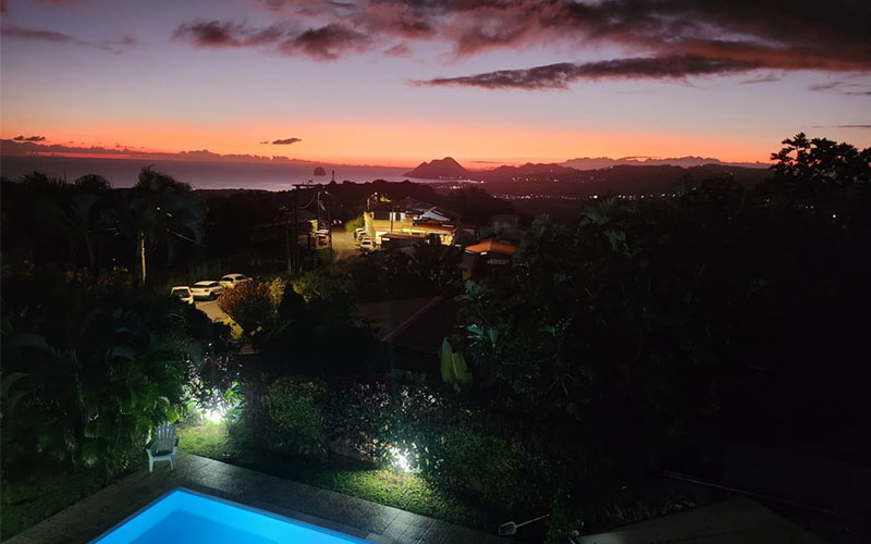 Les couchers de soleil en Martinique sont un véritable spectacle naturel, avec des couleurs éclatantes qui varient du rouge au violet, en passant par l’orange. La côte ouest, notamment à Sainte-Luce, Le Diamant, ou Les Anses d'Arlet, offre les meilleures vues pour admirer le soleil se coucher derrière la mer des Caraïbes. Ces moments sont parfaits pour se détendre, en particulier sur les plages ou en terrasse, avec une vue imprenable sur l'horizon. Que ce soit en se promenant au bord de l'eau ou en profitant d'un cocktail, les couchers de soleil martiniquais sont inoubliables et font partie des plus beaux de la région. Cette photo vous donne un aperçu des beaux couchers de soleil que vous pourrez observer depuis Kasa Vanille.