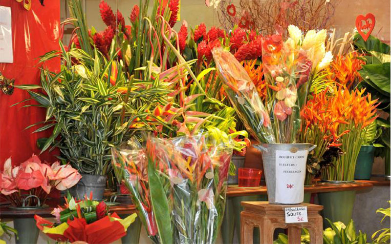 - L'anthurium : Avec ses grandes bractées brillantes, généralement rouges, mais aussi roses, blanches, voire même vertes. La "vraie" fleur est située au centre, sous la spathe, et apparaît sous forme d'une petite structure en forme de cône.