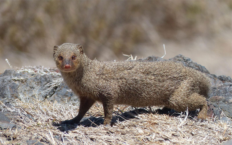La mangouste, ou Herpestes javanicus, est une espèce introduite sur l'île au XIXe siècle pour lutter contre les rats et les serpents. C'est un petit carnivore au corps élancé, avec un pelage brun clair et une longue queue. Bien qu'elle ait initialement été introduite pour le contrôle des nuisibles, la mangouste est devenue un problème écologique, car elle chasse aussi des animaux endémiques, comme les oiseaux et les reptiles. Cela a contribué à perturber l'équilibre de la biodiversité locale. Aujourd'hui, sa présence est surveillée en raison de son impact sur l'écosystème de la Martinique.