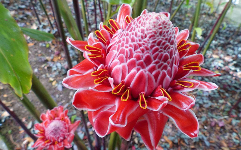- L'alpinia : Elle se distingue par ses grandes fleurs en forme de spirales ou de grappes, souvent rouges, roses, jaunes ou blanches.